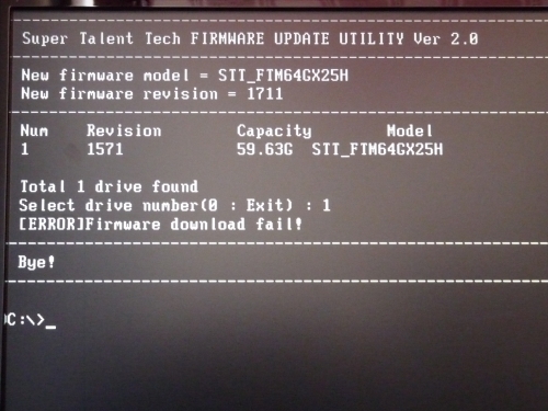 Meine SSD ist ne STT_FTM64GX25H, ich habe auf IDE umgestellt, alle anderen Laufwerke entfernt und boote mit ner guten alten Floppy. Flasher startet, SSD wird gefunden, aber wenn ich dann die Zahl (1) der SSD eingebe, dann bricht der Flasher augenblicklich mit "[Error]Firmware download fail!" ab, sagt höflich Bye! und das wars dann.