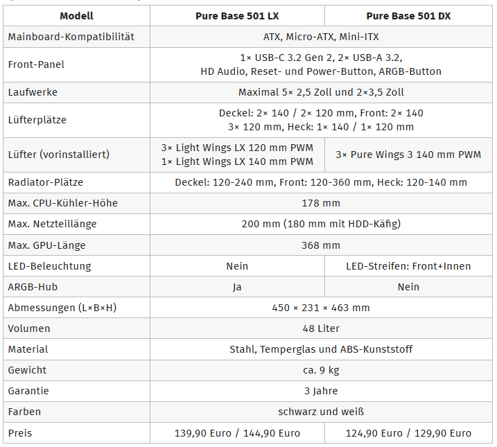 be quiet! bringt am 11. März zwei neue Gehäuse auf den Markt. Das be quiet! Pure Base 501 LX und DX setzen auf den gleichen Aufbau, unterscheiden sich aber in der Art der Beleuchtung. Das Pure Base 501 LX setzt auf beleuchtete Lüfter und hat einen Lüfter-Hub. Das Pure Base 501 DX nutzt LED-Streifen in der Front und im Inneren.