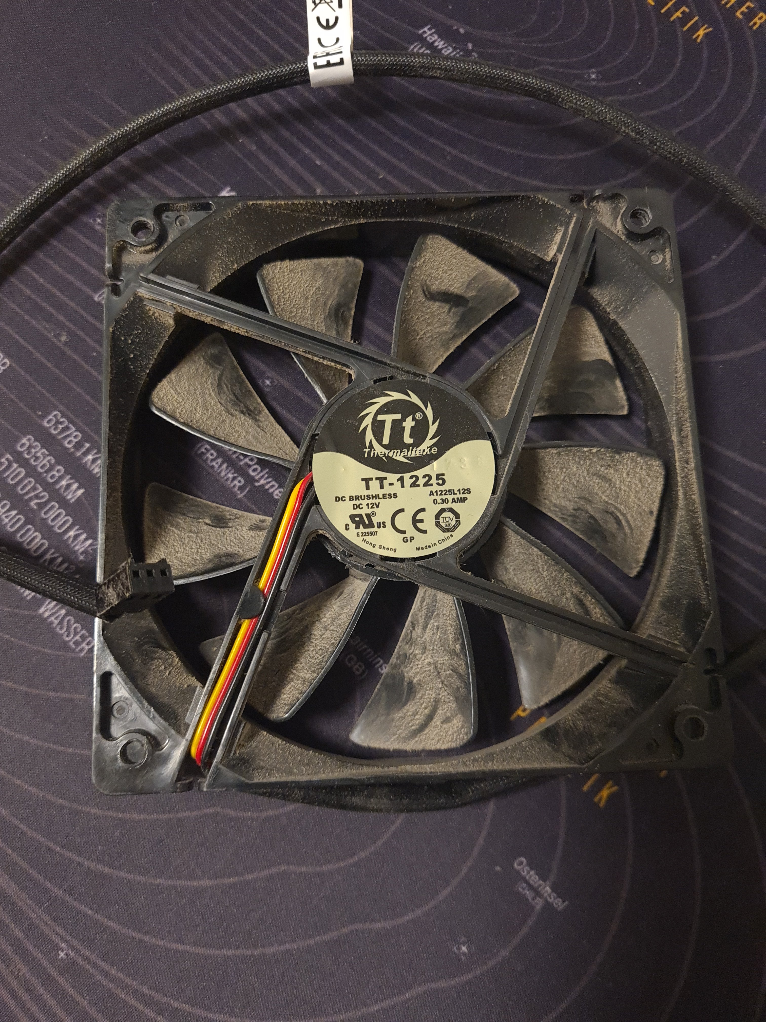 Zwei davon sind im Gehäuse vorinstalliert, um genau zu sein sind 2x Thermaltake TT-1225, als Test habe ich einen ausgebaut und einen rumliegenden be Quiet Pure Wings 2 installiert der allerdings noch lauter und damit nervtötender ist.