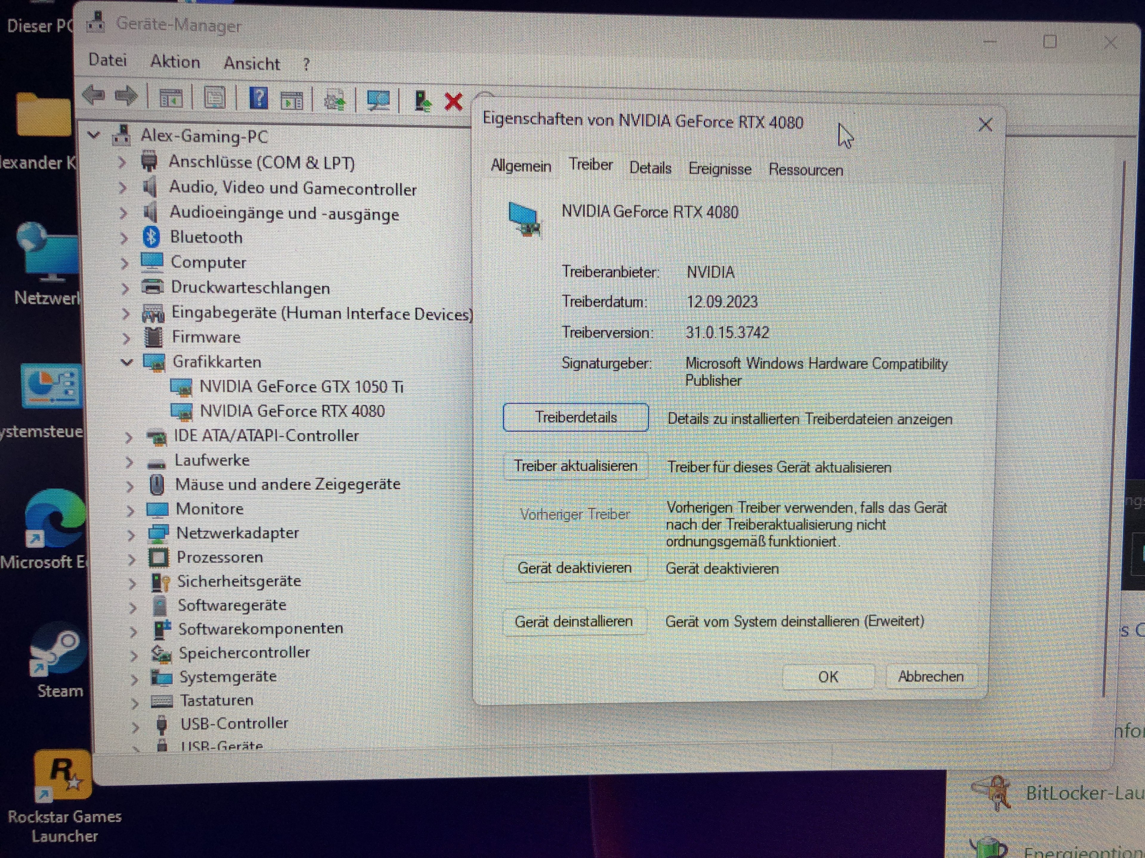 - die Windows-Installation nahmen wir dann mit der 1050ti vor. Danach haben wir die aktuellsten Treiber für die 4080 herunter geladen, installiert und die 4080 dann wieder eingebaut. Aber sobald die 4080 wieder drin war und Windows im Anmeldebildschirm war, fror der Rechner wieder ein.