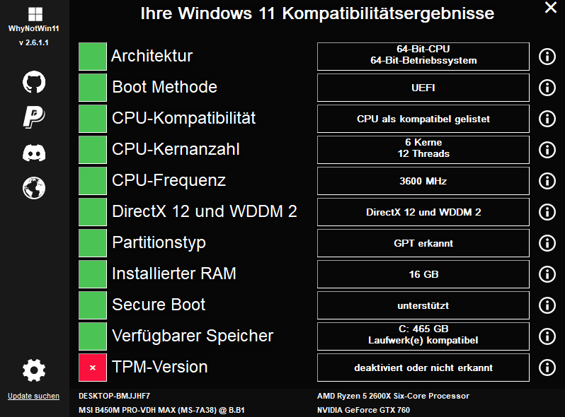 Bezüglich dem Windows 11, die Fehlermeldung wegen der TPM-Version ist mir jetzt auch klar. Ich muss diese noch ändern, dann sollte es hoffentlich klappen...