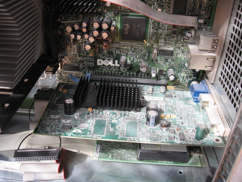 Hier ist mal ein Bild vom Innenleben des Dimension 5100 mit eingebauter passiv gekühlter ATI x300SE (bitte nicht lachen). Da muß die Karte reinpassen. Also vielleicht eher eine flache 1950 Pro mit Lüfter.