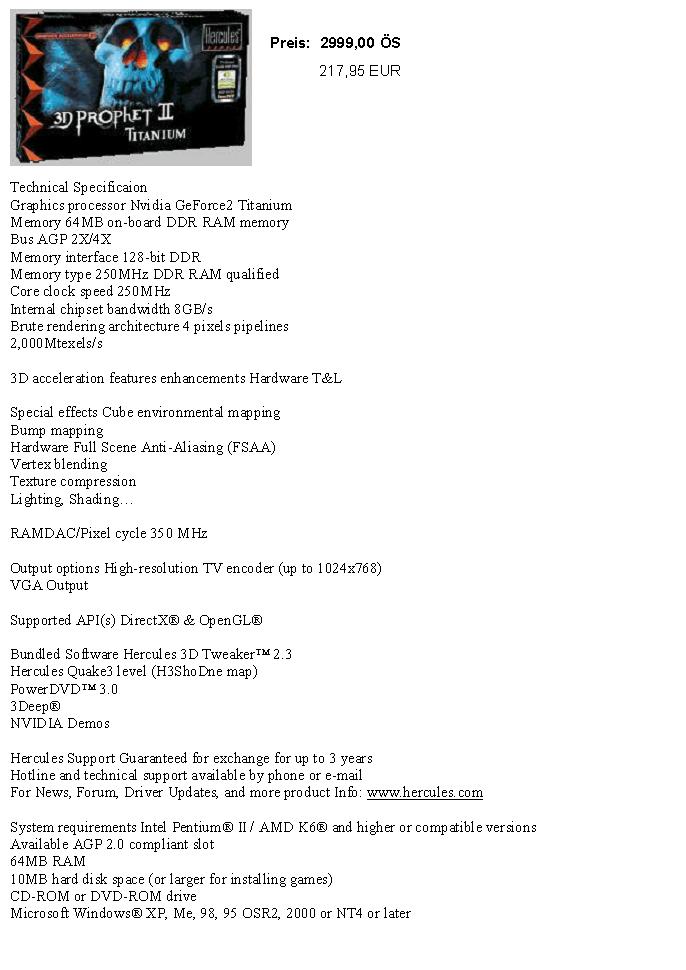 TruForm "fehlt" in gewissem Sinne doch: die originale Radeon (und damit auch die Radeon7500, die ja den gleichen Core besitzt) können TruForm zwar darstellen, nutzen aber Software-Emulation, deswegen sind sie so langsam dabei. Games, die TruForm in vollem Umfang unterstüzten, werden sich somit auf einer RadeonI infintesimal der Unspielbarkeit nähern