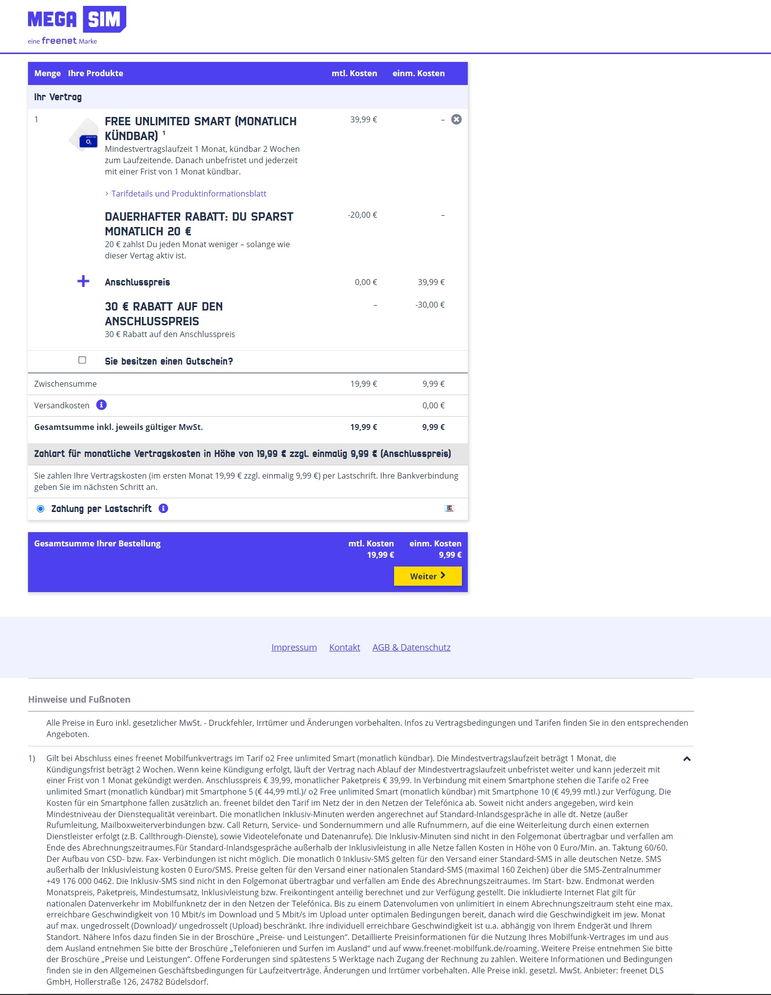 Tarif nennt sich "Free unlimited Smart" monatl. kündbar. Ohne Angebot wollen die dafür 40€ im Monat haben, allerdings über diese Mega-Sim nur 20€/Monat.