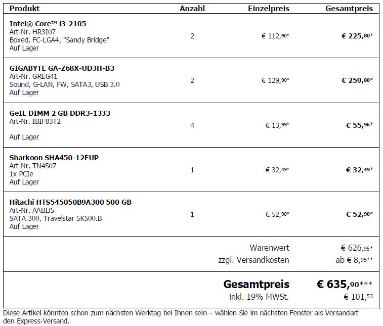 ...Hab grad gesehen, dass CPU, MB und RAM doppelt gelistet sind -> Einmal reicht natürlich!