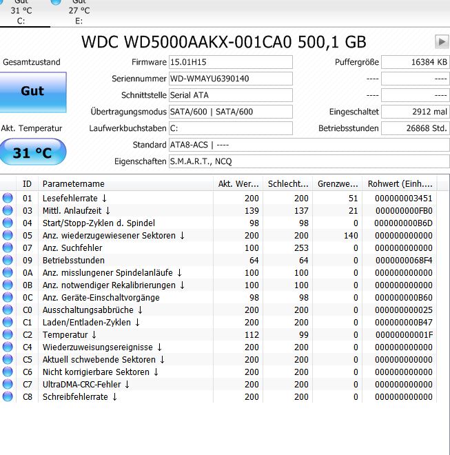 Hallo, ich habe gerade eine neue HDD angeschlossen. Jetzt wundern mich die Werte von CrystalDiskInfo etwas. Zugegeben, ich kenne mich nicht wirklich auch, aber sollte der Schlechteste Wert bei einer neuen Platte eigentlich nicht direkt über dem Grenzwert sein?