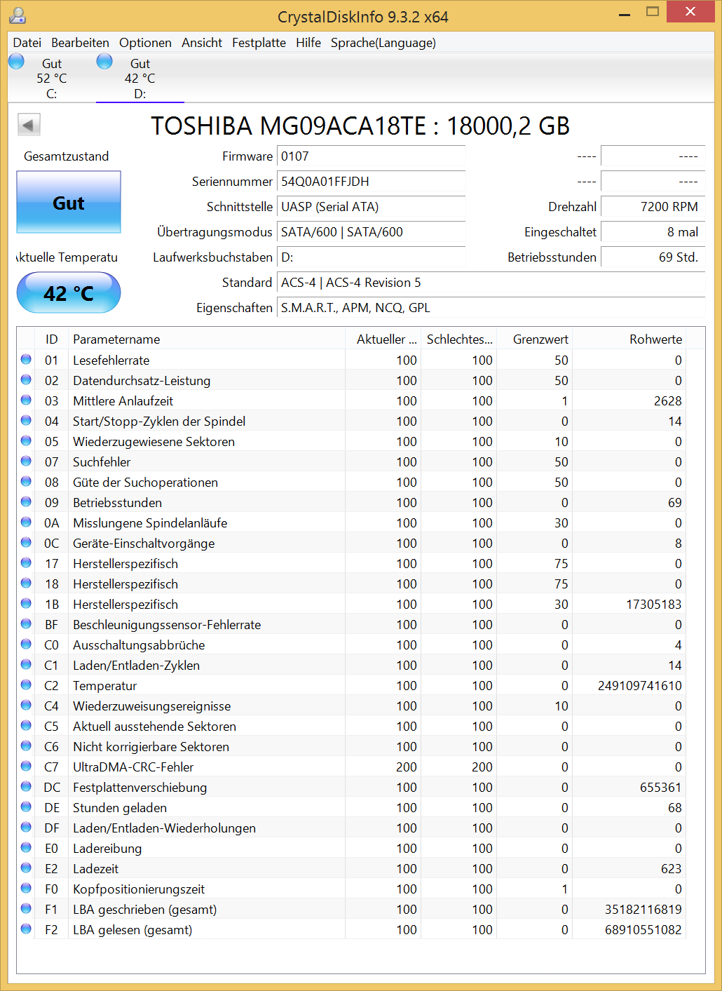 das Thema ist nicht neu und ich habe ausführlich im Forum gesucht, aber dennoch nicht ganz schlau geworden. Ich habe eine neue HDD von Toshiba mit 18TB und fragte mich, ob und wie ich sie jetzt genügend teste, bevor der Widerruf erlischt. Kann jemand was zu den Smartwerten sagen? Scheinen ja in Ordnung, oder? (Anhang), aber da sie neu ist sagt das auch erstmal nicht viel aus?