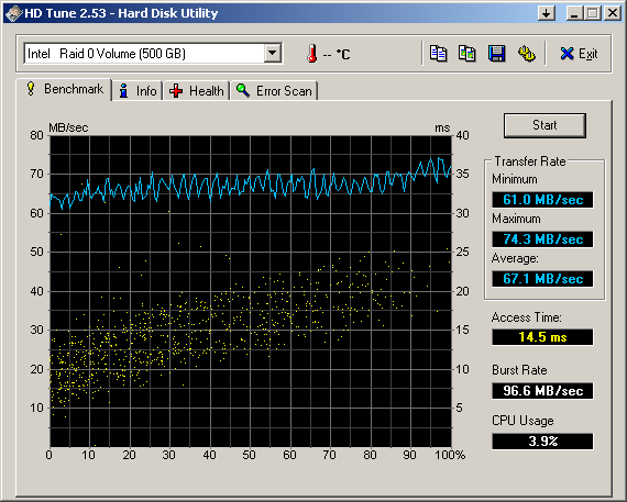 ich denke das es am RAID (wahrscheinlich 0) liegt,es sei denn du hast Vista und testest mit HD-TUNE, denn das zeigt Irgendwas an.