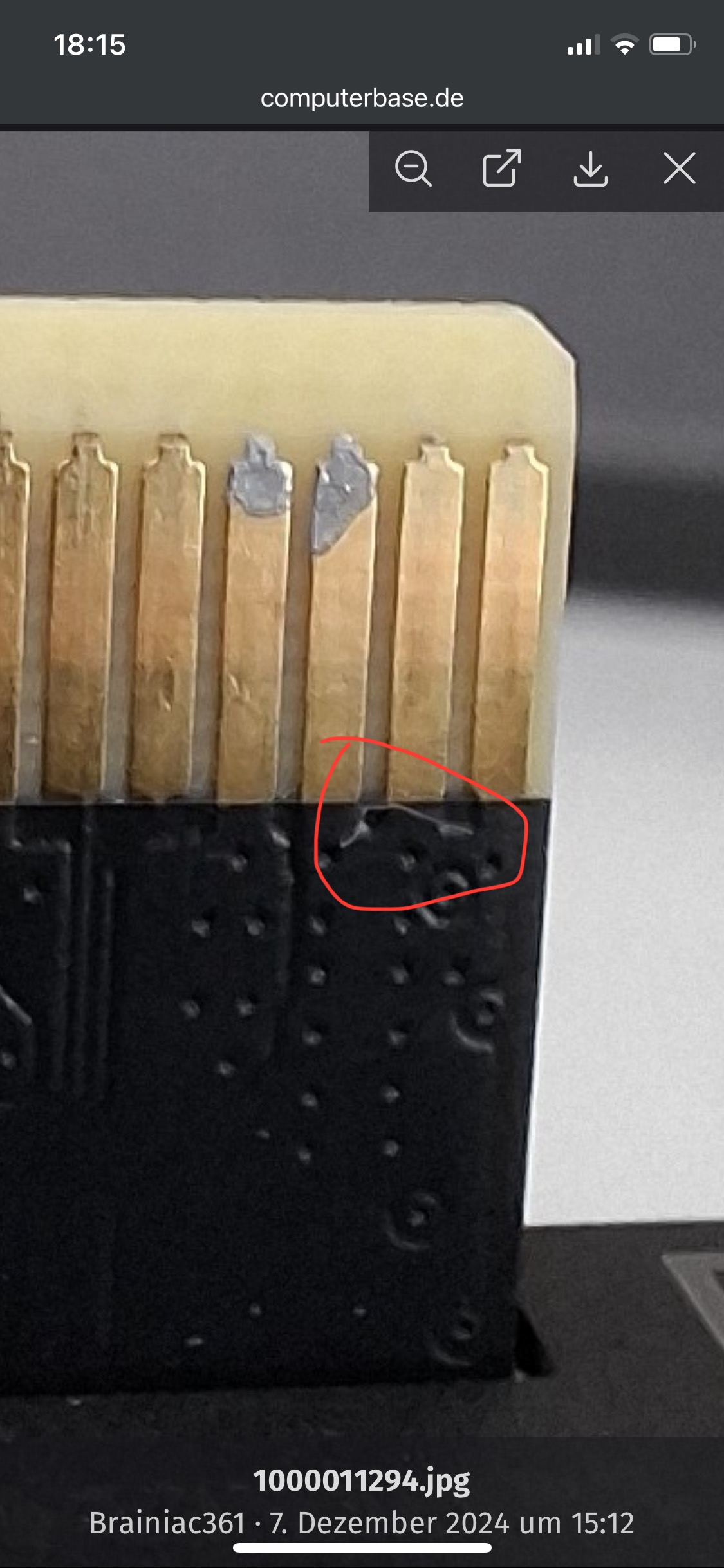 Eine neue NVIDIA-Karte die ich gerade erhalten habe hat auf zwei Pins einen seltsamen Rückstand (siehe Bild), der sich auch mit Isopropanol nicht ablöst.