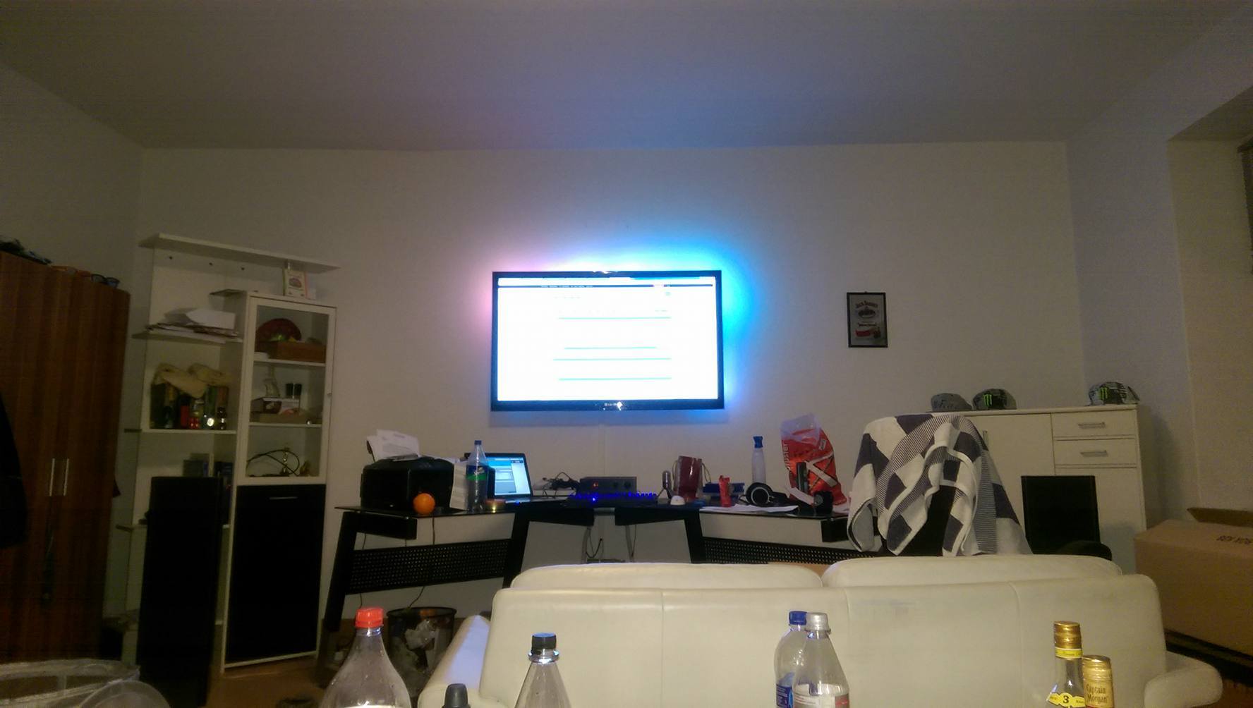 Das Sofa was vorne im Bild zu sehen ist einfach ignorieren, das stand da nur im Weg rum weil sich da jemand zum Schlafen draufgelegt hatte, aber unbedingt vorm Fernseher sitzen sollte. Das Foto selbst ist vom Hörplatz aus gemacht.