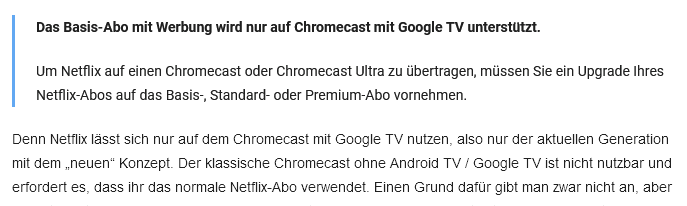 In meinen Augen alles gelogen, andere Anbieter kriegen das über die Chromecast Technologie einwandfrei hin, Amazon Prime und Disney+ können uns immer schön Werbeunterbrechungen anzeigen. Die möchten sicher nur die Kunden zum teureren Abonnement drängen.Bei werbefinanzierten Abos ist es nicht möglich, ein mobiles Gerät zu verwenden, um Netflix auf einem Fernseher zu sehen. Wenn Sie Ihr Mobilgerät benutzen möchten, um Netflix auf einem Fernseher zu sehen, müssen Sie zu einem werbefreien Abo wechseln.