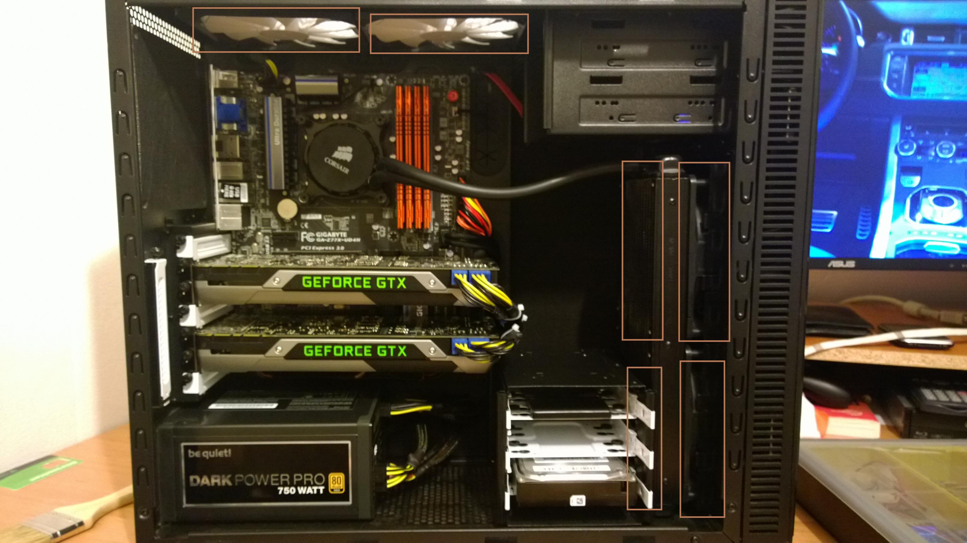 Vorne in Gehäuse ist der Radiator eingebaut mit den 2 Standard Lüftern und den 2 Lüftern vom R4.