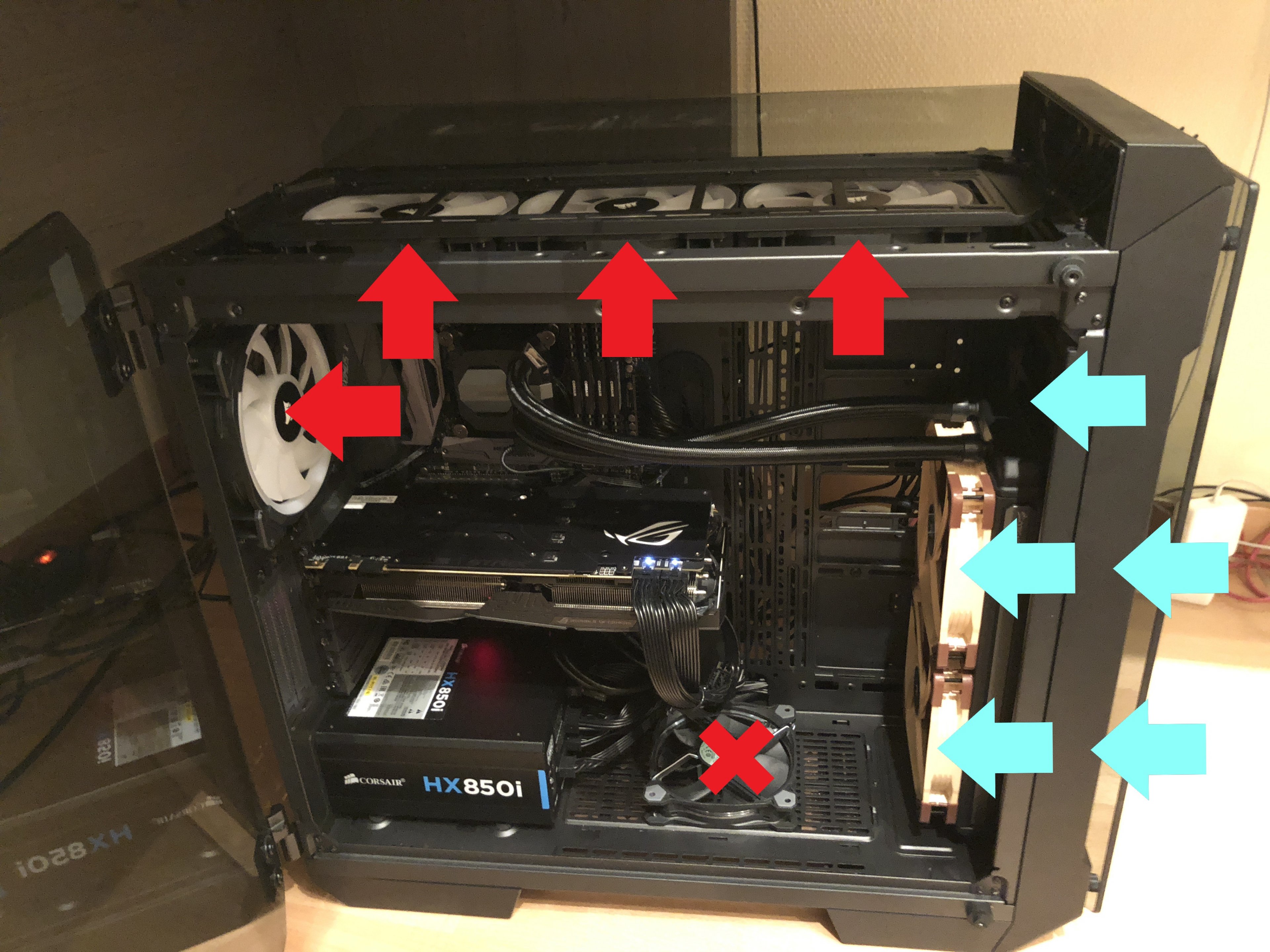 Lüfter wie folgt : AIO front push/pull (4x140mm, davon 2 Noctua) und als 3. in der Front noch nen 120mm (Luft nach innen), 3 Lüfter oben (nach aussen) und 1 hinten (nach aussen).