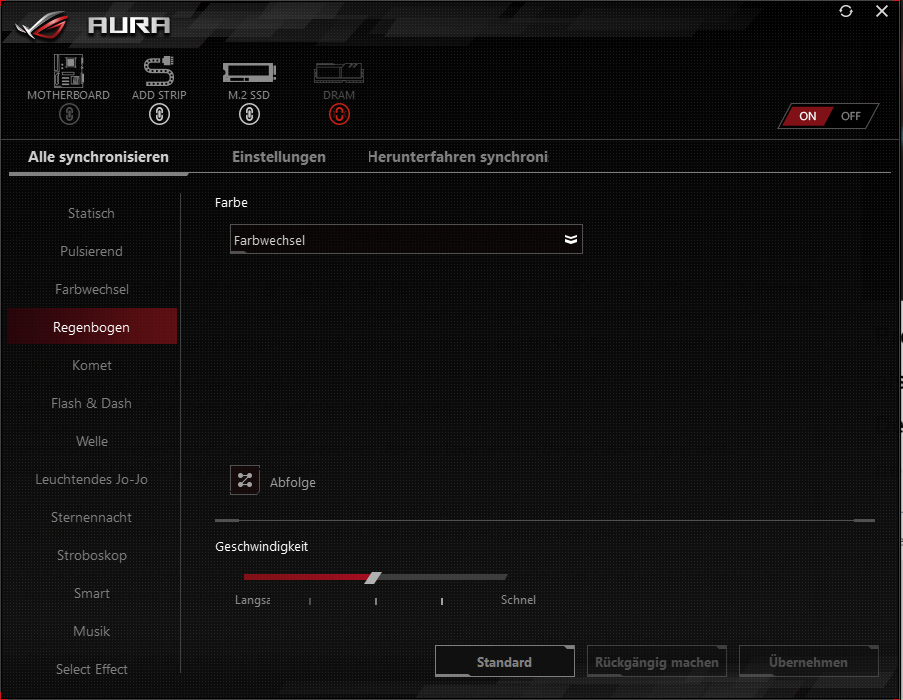 DIe SSD ist Asus AURA Sync kompatibel, wird dort auch angezeigt und ist angewählt, aber sie leuchtet nur ab und zu hellrosa... (Das wäre das zweite Problem neben dem Speicherproblem...)