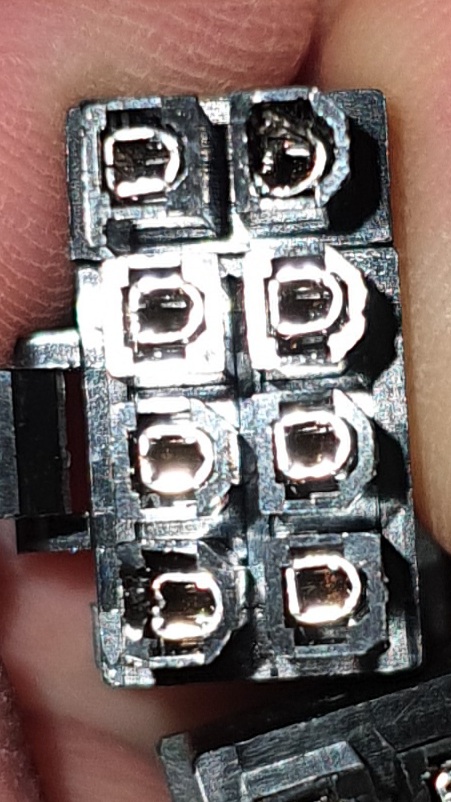 Das ist nicht geschmolzen, das ist gebrochen, unten links sieht so aus als ob der Stecker und pin gebrochen ist und oben rechts rechts der ist auch mit Gewalt verbogen worden.