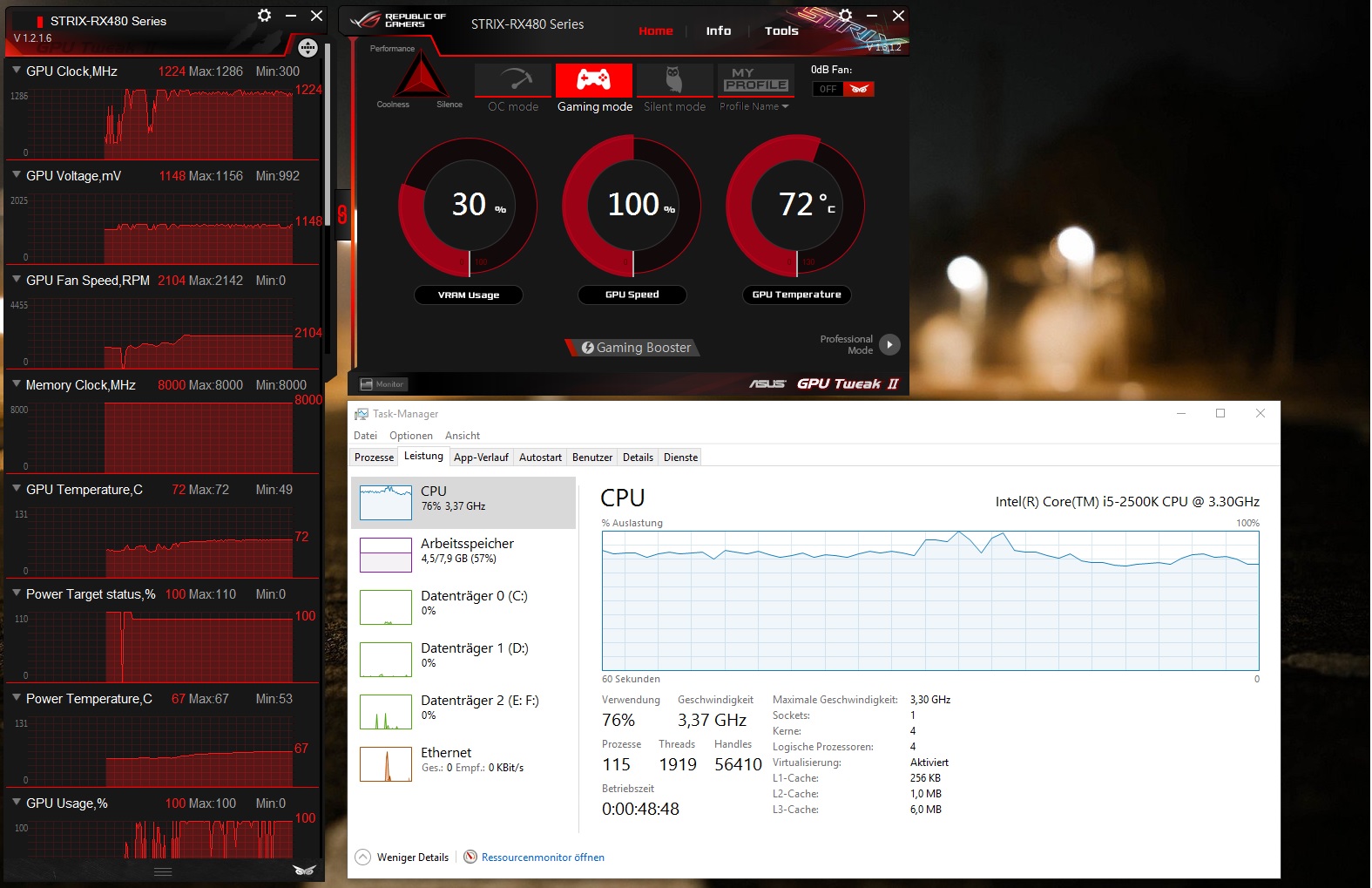 Getestet habe ich bisher das aktuelle Doom und Formel1 2016. Bei beiden Spiele (bei Formel 1 fällt es besonders auf), habe ich alle 2-3 Sekunden ruckler. Die CPU Auslastung liegt bei ca. 82%. Die Einstellungen bei Doom und Formel1 2016 sind beide auf Maximum (Ultra) eingestellt gewesen. Zum Test habe ich dann bei Formel1 2016 auch mal alles auf Ultra-Low gestellt und das Problem ist in leicht abgeschwächter Form immer noch vorhanden.