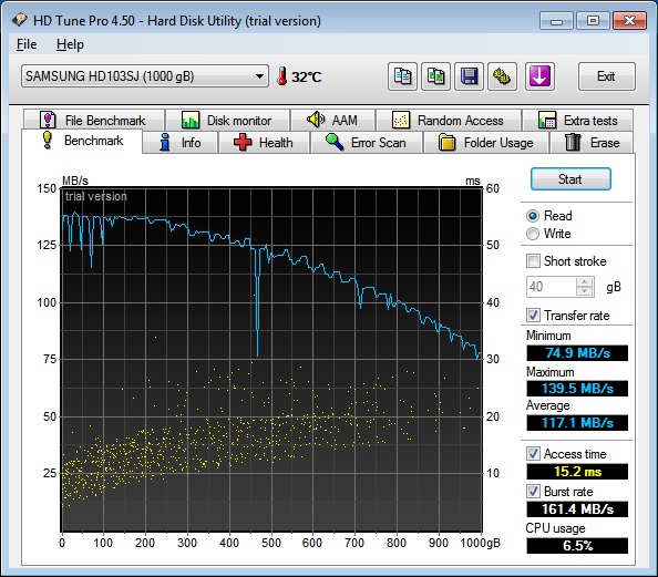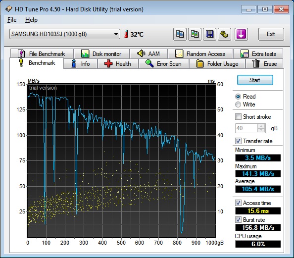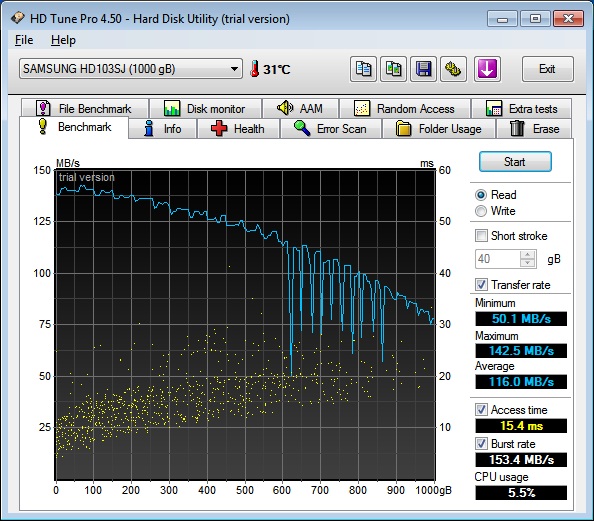 habe gestern die Teile für einen neuen PC erhalten, alles zusammengeschraubt und soweit so gut läuft er auch. Lasse seit heute früh ein paar Programme wie Prime95, Memtest86 unter DOS, HD Tune und so durchlaufen um zu checken ob wirklich alles in Ordnung ist. Bei HD Tune irritieren mich allerdings die Ergebnisse des Benchmarks, denn die Samsung-Platte aus dem Titel geht manchmal im Tempo extrem runter...