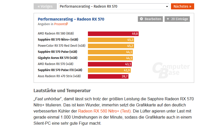 LEISE sein soll landet man durch Empfehlungen und Tests (z.B. von CB) schnell bei der Sapphire Radeon RX 570 Nitro+ OC, die schon fast einen überdimensionierten Kühler besitzt.