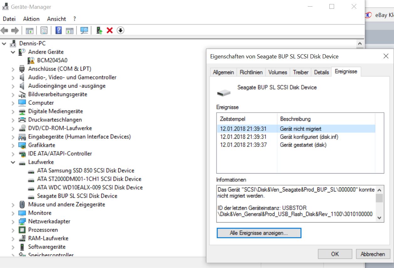 habe gerade meine neue, von Amazon bestellte Seagate Backup Plus 5TB ausgepackt und an meinen PC mit Windows 10 angeschlossen. An allen USB 2.0 Ports wird sie sofort erkannt, es wurde auch sofort automatisch ein Treiber installiert. Bei allen 3.0 USB Ports wird aber nichts erkannt. Die HDD leuchtet zwar und wird im Gerätemanager erkannt als "Seagate Expansion USB Drive" aber das ist auch alles... im USB 2.0 Betrieb heisst die HDD im Gerätemanager "Seagate BUP SL SCSI Disk Drive"...davon mal ein Ausschnitt samt Ereignissen der HDD wo unter anderem steht Gerät nicht migriert... um Hilfe wäre ich dankbar.