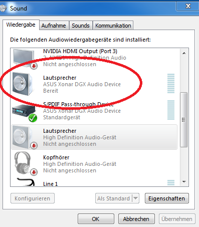 Du musst das Gerät Lautsprecher Asus Xonar DGX Audio Device als Standard Wiedergabegerät einstellen. Dann müsste es klappen.