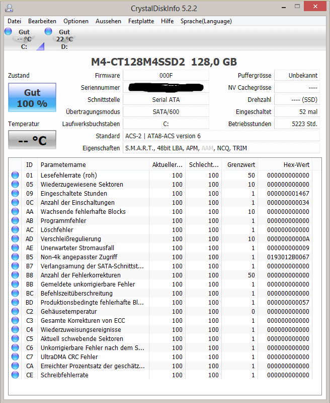 ich habe bei ebay eine neue Crucial M4 128GB von einem Händler gekauft. CrystalDiskInfo zeigt mir an das die SSD 5223 Stunden auf dem Buckel hat und 52 mal eingeschaltet wurde. Wenn das stimmt hat der Händler mich betrogen, verkauft dann gebrauchte Ware als neu. Wie zuverlässig ist die Anzeige in CrystalDiskInfo, woher kommen diese Daten? Was soll ich tun, SSD zurück schicken?