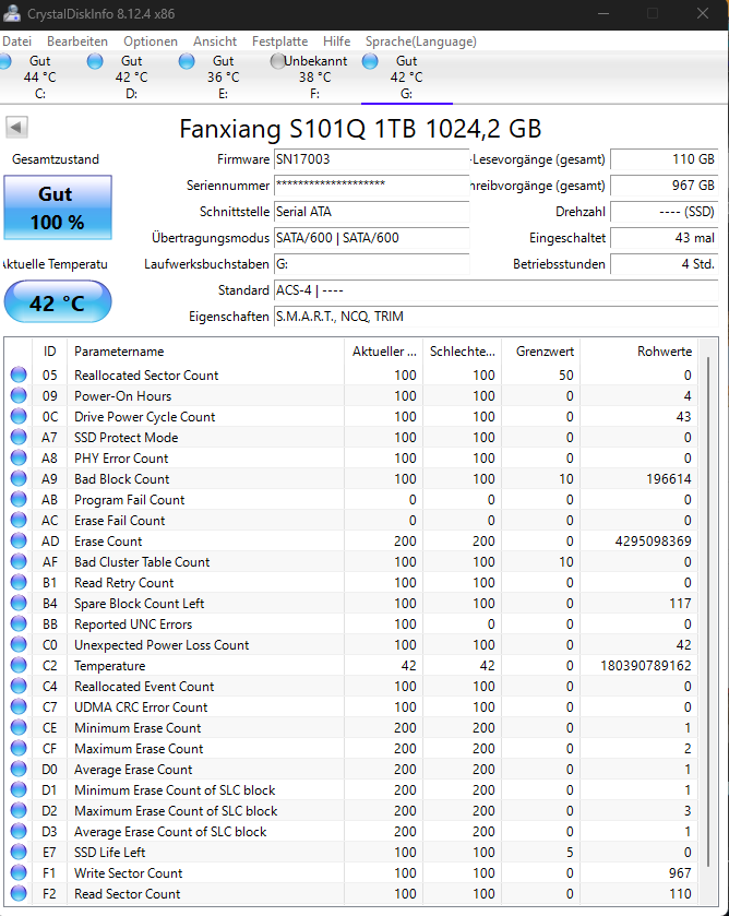 ich habe gerade eine neue Fanxiang S101Q 1 TB SSD erhalten und direkt mit CrystalDiskInfo geprüft. Dabei fällt mir Folgendes auf: