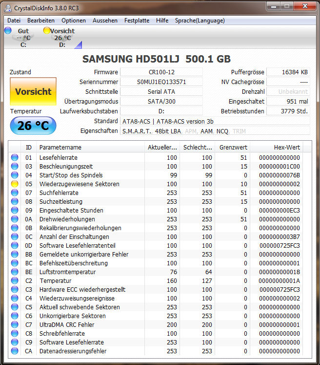 Ich glaube ich brauche eine neue Backup-Platte. Lt. Crystal Disk Info ist schon Vorsicht geboten. Da diese Platte wirklich als Backup und Abreitsplatte arbeitet, würde ich nur sehr ungern Datenverlust haben wollen.
