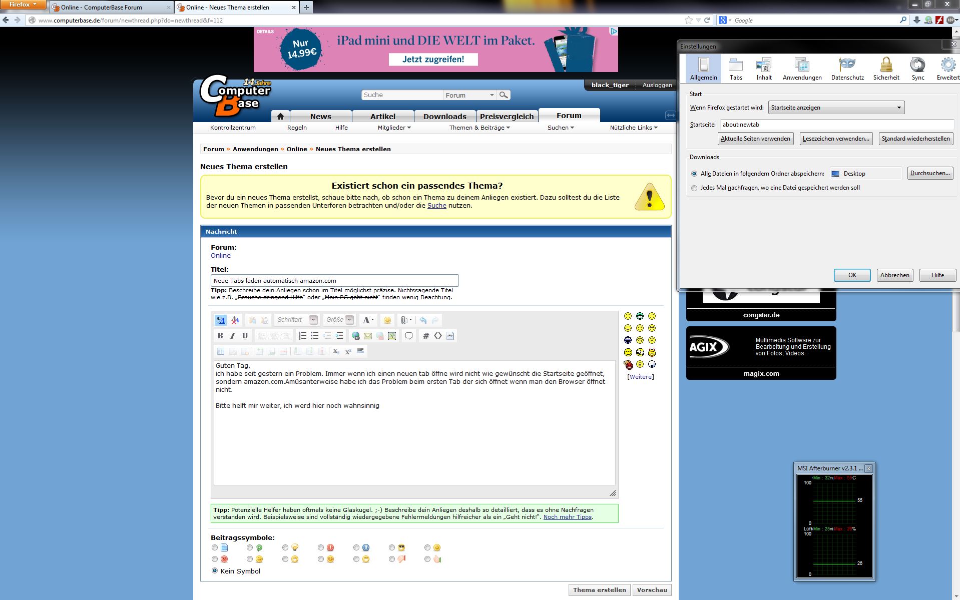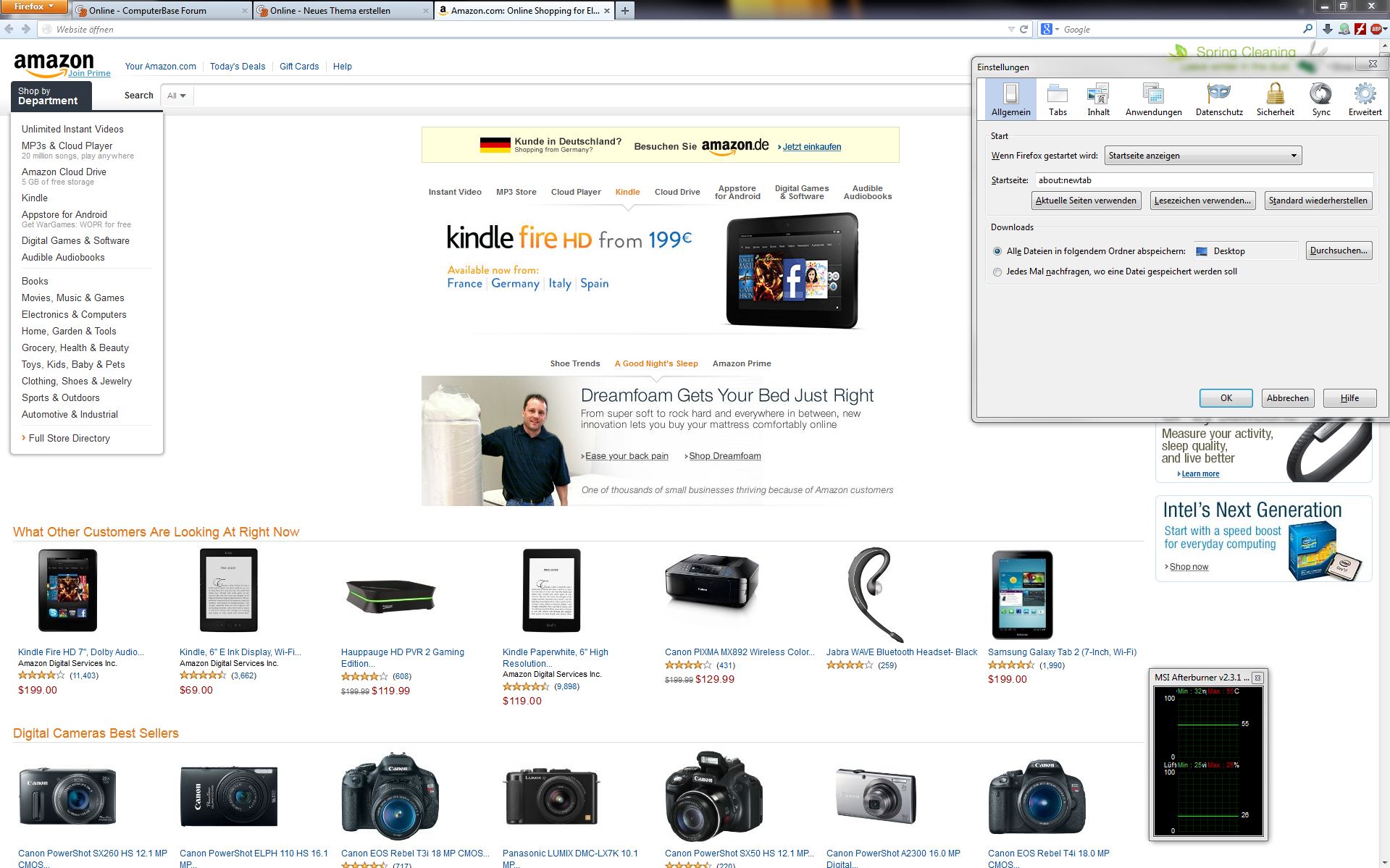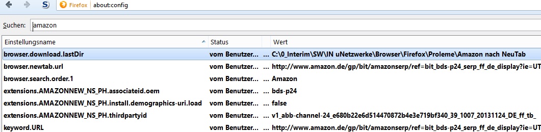 ich habe seit gestern ein Problem. Immer wenn ich einen neuen tab öffne wird nicht wie gewünscht die Startseite geöffnet, sondern amazon.com.Amüsanterweise habe ich das Problem beim ersten Tab der sich öffnet wenn man den Browser öffnet nicht.
