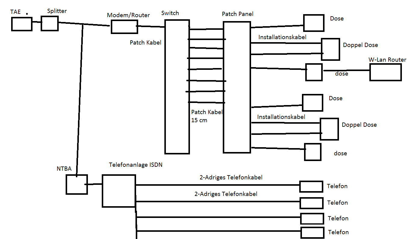 Ich habe ein 2-Familienhaus und in meiner Wohnung befindet sich eine alte Telefonanlage der Telekom und ein durch die Zeit immer wieder erweiterte Internet Verkabelung (d.h vom Hauptinternetanschluss immer mehr Anschlüsse gelegt, dass mittlerweile ein Chaos hier hersch