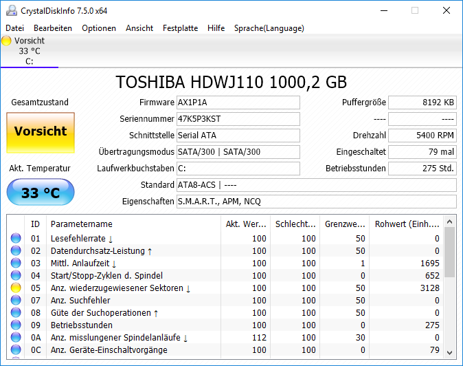 Liegt es vielleicht an über 3000 wiederzugewiesenen Sektoren? Ich habe zwar gelesen, dass sie nicht wirklich gut sind, aber nirgendwo gesehen, ab welcher, und vor allem ob man sich bei so einer Zahl Sorgen machen sollte.