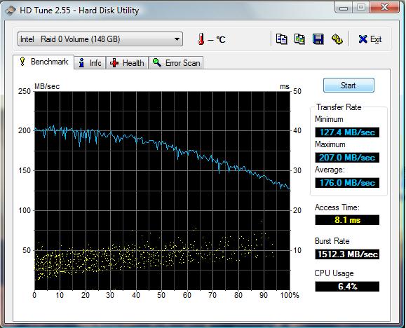 Du verdoppelst im Idealfall die Transferrate und das über den gesamten Kapazitätsbereich. Deswegen sieht eine Kurve im RAID0 fast genauso aus wie bei einer einzelnen Platte, nur eben um den Faktor 2 höher. Schau dir doch einfach den geposteten Screen an. Hier noch welchehttps://www.computerbase.de/forum/threads/hd-tach-hd-tune-ergebnisse.50408/page-13#post-6761723Aber im RAID Verbund sind die Leistungen im Minimum-Average-Maximum Bereich immer besser und liegen auch näher beieinander,als bei einer einzelnen Festplatte.