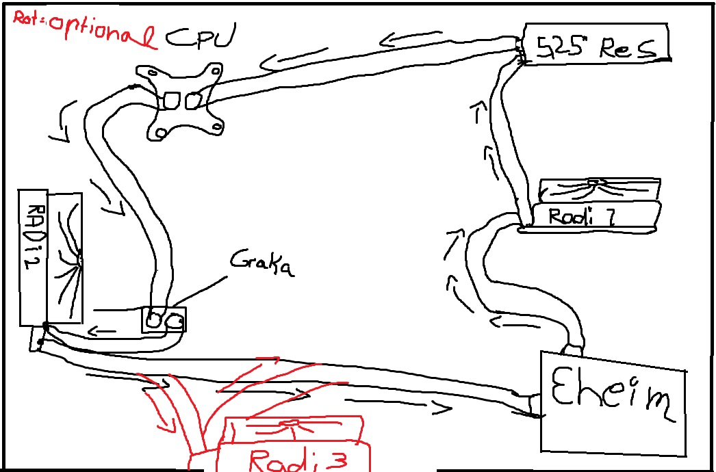 Da ich im Moment noch kaum Plan vom System der Wakü habe frage ich euch ob meine kleine Zeichnung xDD das richtige Prinzip hat und wenn nein wie ich es machen soll (3 min zeichnung sry)