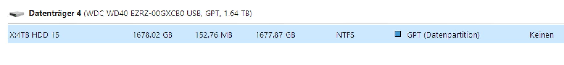 ich habe mir für meinen Multimediaplayer eine neue 4TB HDD von WD gekauft (WD40EZRZ). Nun habe ich, wie immer, die Platte in meinem exterem USB-Gehäuse gesteckt, um sie für den Multimediaplayer vorzubereiten. Habe die Platte also unter Win10 in NTFS und GPT formatiert. Aber es werden mir nur 1,63 TB angezeigt. Habe die Platte sowohl mit Win10, als auch mit dem Tool von WD überprüfen lassen. Alles in Ordnung. Habe die Platte an verschiedenen USB Ports ausprobiert. Immer das Gleiche. Festplattengröße stimmt nicht. Dann mal mit MBR initialisiert und zurück auf GPT. Nichts. Dann die Platte mal in meinen Multimediaplayer gesteckt. Hier werden mir auch nur 1,63 TB angezeigt. Auch Mini Tool Partition Wizard konnte nicht weiterhelfen.