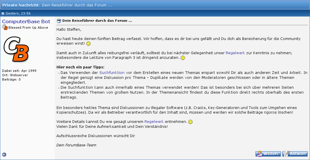 Nachdem neue Boardies ihren fünften Beitrag verfasst haben, bekommen sie nun automatisch eine PM von unserem ComputerBase Bot.