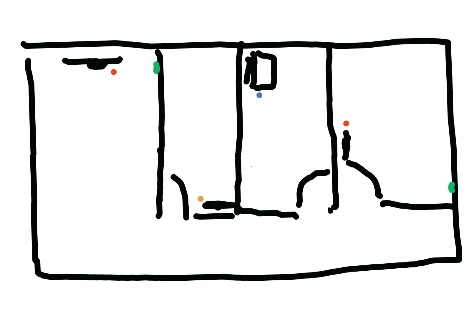 Es gibt zwei Telefonsteckdosen (grün) für das Modem. Daran müssen zwei TV Boxen (Rot) angeschlossen werden, ein Computer (Blau) und eine PS4 (Orange).