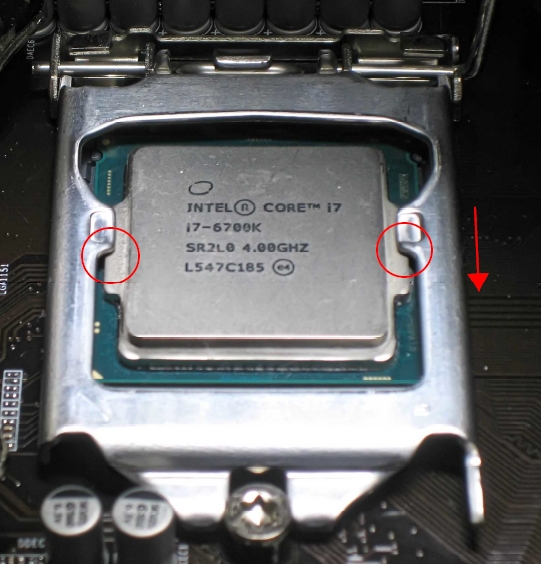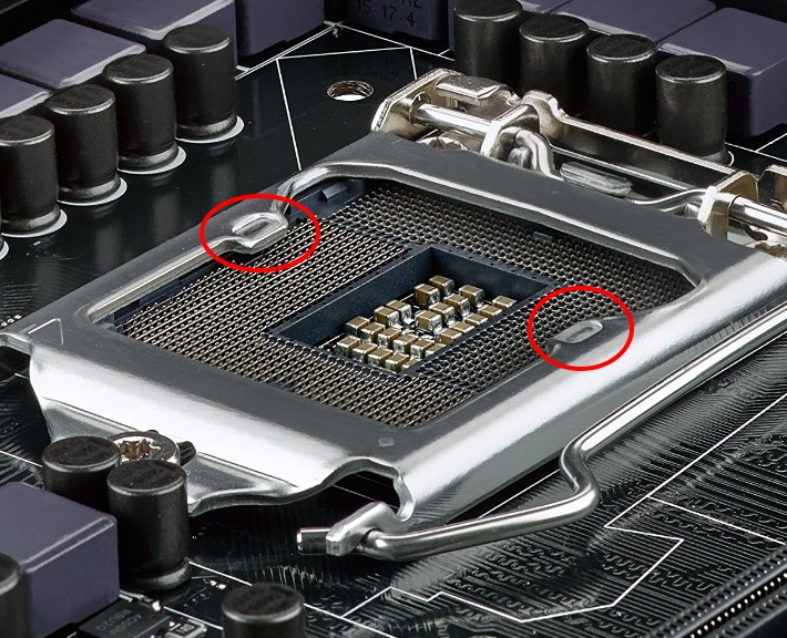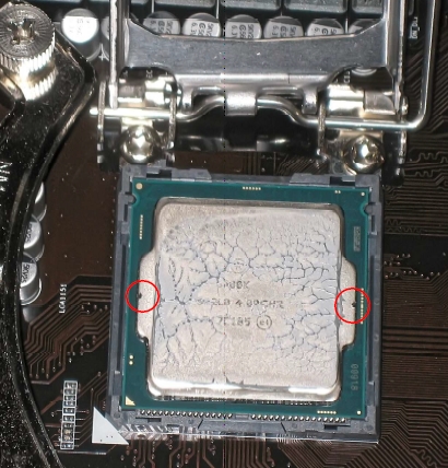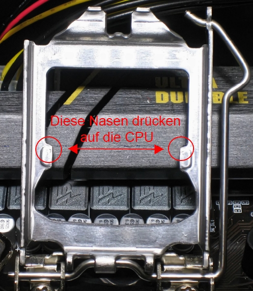 Es gibt keine verbogenen Pins am Sockel und auch sonst scheint alles OK. Was mich etwas irritiert sind die beiden kleinen Marken links und rechts am Prozessor (mit roten Kreisen markiert). Wird auf den beiden Punkten die CPU an die Sockelpins gedrückt, oder stimmt da was mit dem Haltebügel nicht ?