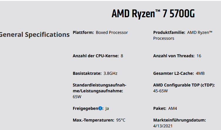„AMD gibt für den Ryzen 7 5700G eine TDP von 65 Watt an. Diese kann unter Last jedoch um den Faktor 1,35 erhöht werden. Dies konnten wir beim Stresstest auch so bezeugen, denn maximal lag der Energiebedarf der APU bei knapp 87 Watt. Bei den Temperaturen gab es aufgrund der verbauten AiO keinerlei Probleme. Beim Prime95 Lasttest notieren wir mit 57 °C die höchste Temperatur.“