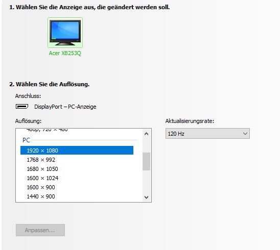 ich habe gestern meinen neuen IPS Gaming Monitor aufgebaut und festgestellt das ich maximal nur 120Hz einstellen kann. Das mitgelieferte Kabel (Displayport) müsste eigentlich nicht das Problem sein, da ich den selben Monitor letzte Woche bei meinem Bruder aufgebaut hatte und bei ihm gings ohne Probleme, jedoch hat er eine GTX 960.