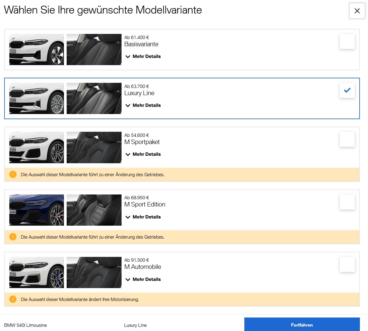 Na ja so ganz stimmt das auch nicht ^^tree-snake schrieb:BMW hat das auch vereinfacht. Motor,Felgen,Farbe und dann die Paket-Auswahl zwischen Basis;Luxury,Sport, M-Paket. Fertig. Natürlich kannst dir dann noch spezielles Zeug reinmachen wenn man das will/braucht, aber zu 90% reicht ein M-Paket : )