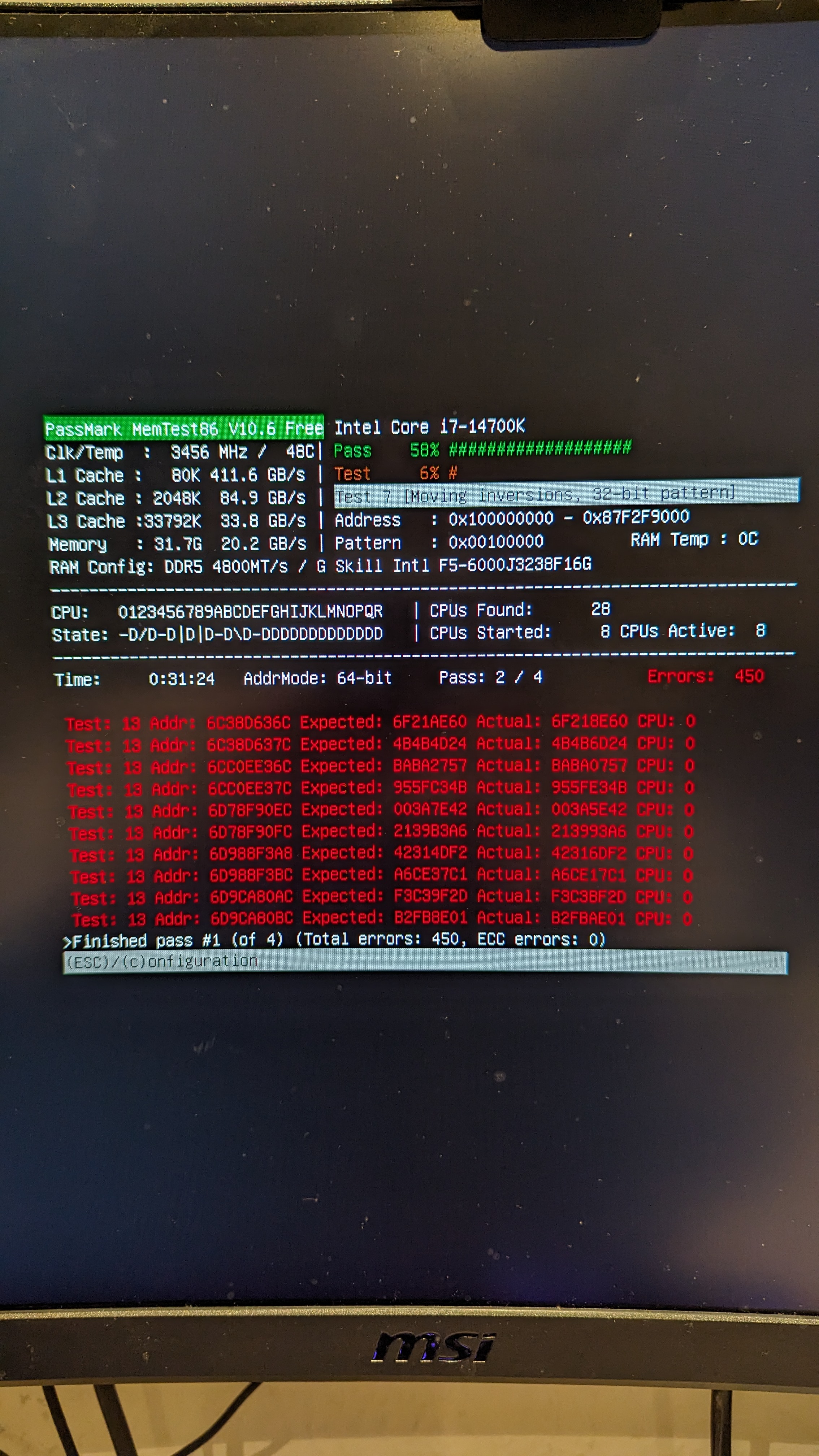 Ich habe daraufhin einen MemTest86 gestartet. Bis jetzt sind beim ersten Testdurchlauf 450 Fehler aufgetreten.