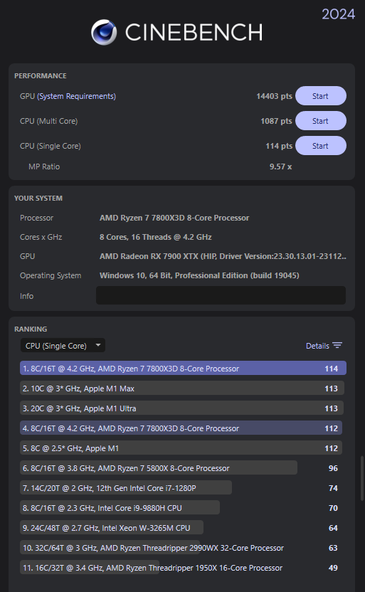 das mein Multicore score etwas low ist ist mainboard und 240er aio geschuldet denn mainboard sensoren spinnen etwas in bios zeigt mir sensor 4°C an in idle windows 51°C und beim zocken 85°C gerade beim r24 92°C daher ich muss mal anderes board und aio 360er besorgen dann sollte die etwas höher sein