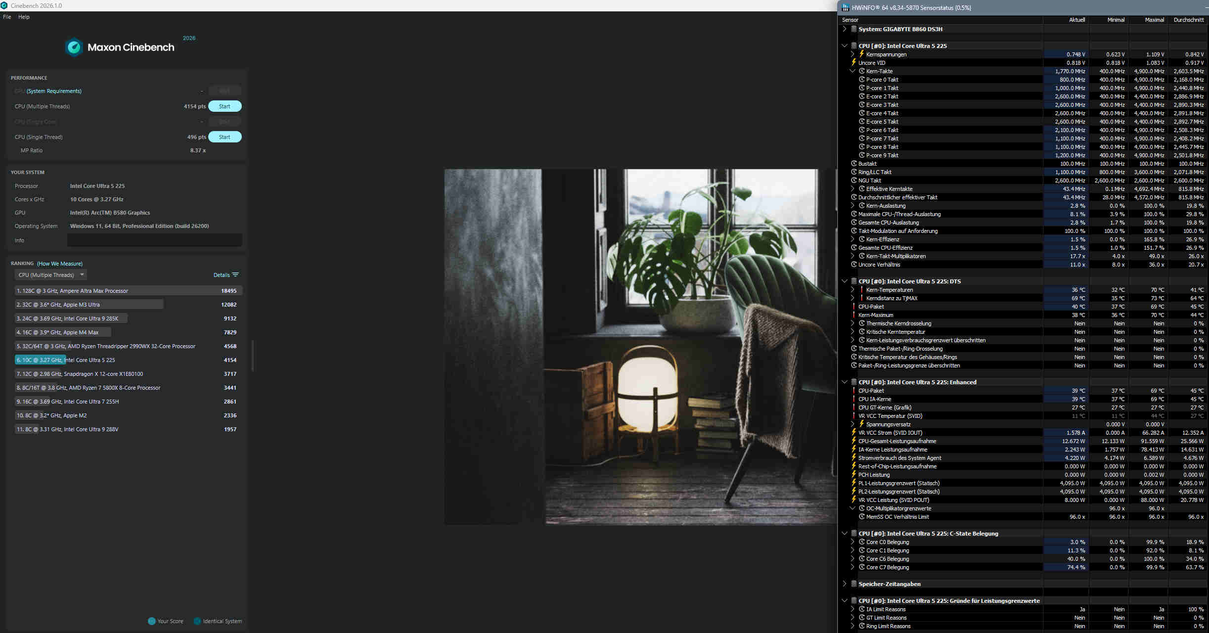 CPU Core Ultra 225 läuft im BIOS mit Profil Gigabyte statt Intel Performance oder Intel Standard, daher kein hartes 65 Watt Powerlimit. Single Core Test ist nicht möglich, da die CPU kein HT / SMT hat und somit das Ergebnis dem Single Thread gleichen würde.
