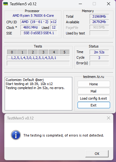 00:01:12 - Error - CPU + RAM - 3 error(s) found on physical core #0 - logical core #1