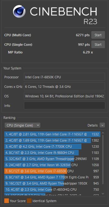 Was ich aber immer wieder interessant finde bei den Community Benches hier, wie weit die CPUs teilweise auseinder liegen. Z.B. der Xeon E3-1230 v3, da liegen im SC zwischen dem besten und dem schlechtesten Ergebnis (@sPraylol) 25 % oder beim Ryzen 7 3700X, da ist die CPU ohne SMT von @cruse 52 % hinter dem besten Ergebnis im MC. Und entweder hat @HasseLadebalken ein Golden Sample vom Ryzen 5 2600 oder er hat das X hinter den Zahlen vergessen