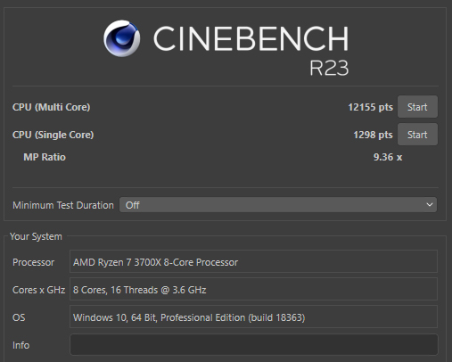 Windows 10 mit 3 R23 Durchläufen. Niedrigste