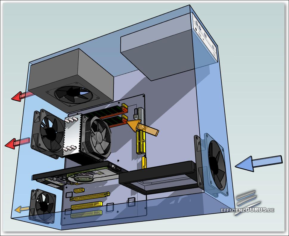 Ich hab selber ein Coolermaster Gehäuse (Storm Rev.1). Hab dort vorne einen 140mm Fan reinpusten, dann der CPU Kühler und dahinter ein 140mm an der Rückwand die die Abwärme rauspusten. Dazu noch ein 240mm ob Deckel der auch rauspustet, alle auf 1000 U/min. gedrosselt, damits SIlent bleibt. Auch meine Graka ist auf unhörbar gestellt, da die interne Kühlung schon optimal ist.