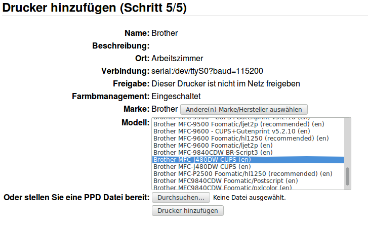 Jetzt habe ich es nochmal gemacht, weil ich mir unsicher bezüglich der Reihenfolge beim ersten Mal war. Es funktioniert immer noch nicht. Habe sogar das System nochmal neu gestartet und geschaut, ob sich etwas geändert hat. Was aber nicht eingetreten ist.Photon schrieb:Ich denke, du hast den Drucker via CUPS eingerichtet, bevor der Treiber von der Brother-Webseite installiert war.