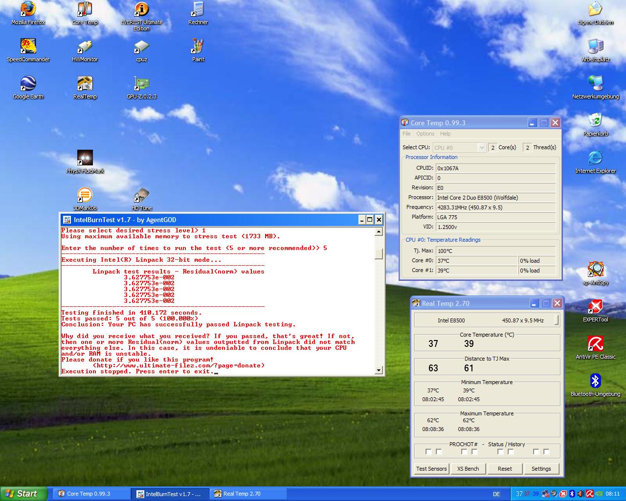 Nun zur Frage, habe eine E8500 mit E0 Stepping(*freu*) die ich mit einem Scythe Shuriken kühle. Das gute stück läuft jetzt allem anschein nach mit 1,2 (1,25?)vcore zumindest kam dieser Wert nach einer halben Stunde Everest bei CPU-Z heraus. Schätze im Bios wird alles auf Automatik stehen, hab da noch garnicht reingeschaut.