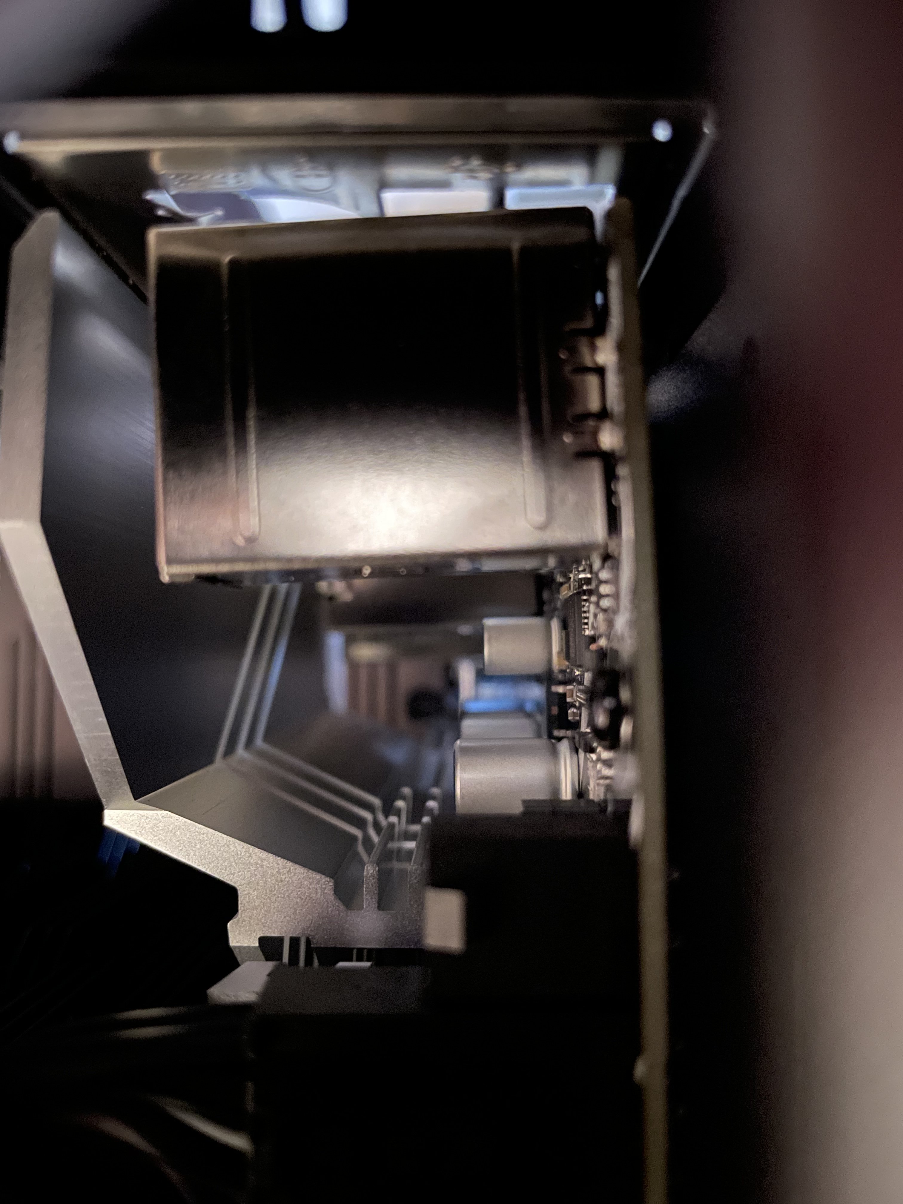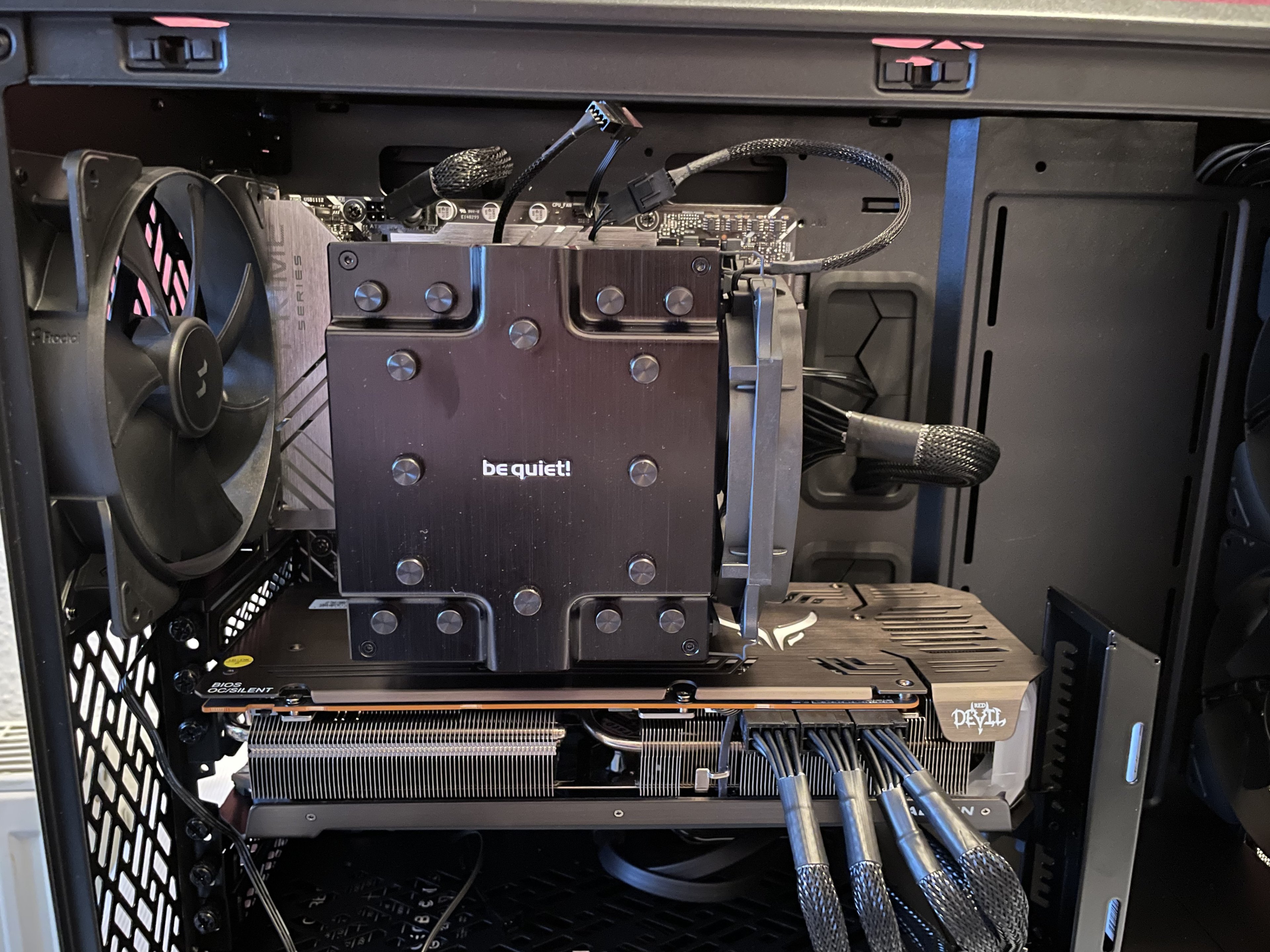 3. Die Grafikkarte (RX 6900 XT red Devil Ultimate) hat mich gestern fast zur Verzweiflung gebracht. Es ist einfach so ein riesenteil, dass es extrem schwer war den oberen PCI slot zu treffen, da man kaum was sieht. Zwischendurch hat sich die Karte leider auch kurz im Steckplatz verhakt, aber ich konnte Sie mit viel Gefühl wieder abnehmen und sie sitzt jetzt wie soll. Natürlich beschleicht mich ein Gefühl, dass die Grafikkarte von dem kleinen Missgeschick schaden davon getragen hat, aber ein Weg das zu prüfen wäre wohl nur den PC anzuschalten.