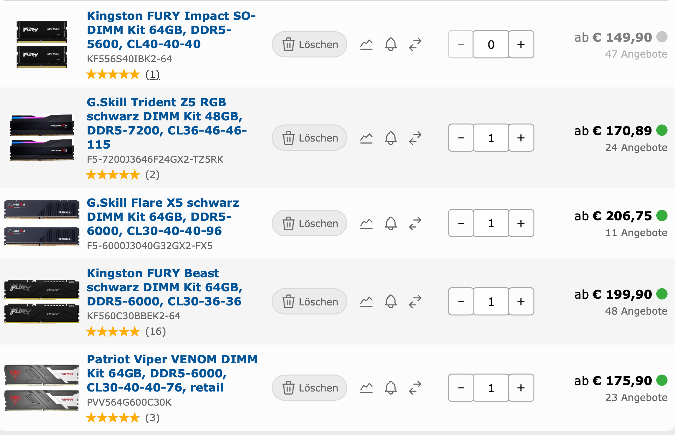 - 48 oder 64 GB DDR5-Ram mit mindestens 6000 Mhz (was ist hier besonders zu empfehlen?) -> siehe Screenshot anbei